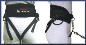 Można go zrobić samemu np. z uprzęży do wspinaczki skałkowej ale zdecydowanie lepiej kupić specjalny pas w dobrych sklepach z akcesoriami dla psów. Pas do canicrossu powinien być odpowiednio szeroki (przynajmniej 8 cm) i miękki w części przylegającej do pleców. Z przodu powinien być zaopatrzony w jedno lub dwa metalowe kółka lub karabinki, do których przymocowana jest lina ciągowa. Dobrze jest jeśli sposób mocowania liny umożliwia jej szybkie wypięcie w razie nagłej konieczności. Najlepsze pasy posiadają specjalne paski, które po przełożeniu pod nogami zapobiegają przesunięciu pasa do góry i umożliwiają płynną regulację punktu przyłożenia siły ciągnącego psa, który to punkt powinien być umiejscowiony poniżej pasa na wysokości bioder.