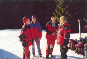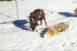 Andrzej przemyka koło mnie z psami - ja człapię jakieś 500 m aż zrobi się trochę równiej. Zapinam narty - nie mogę trafić w cholerne dynafity - ruszamy dalej. Jakieś skrzyżowanie szlaków, lasek - i widać "Chatę Cietrzewi"- to tam ma być meta. Lekki zjeździk i wpadamy na metę. Koniec. Z psami kierujemy się w kierunku lasku gdzie mamy rozbić biwak. Na chwilę padamy. Zaczynamy rozbijać biwak gdy podjeżdżają do nas dwa skutery śnieżne z napisem TAXI - to nasi sponsorzy z naszymi kobietami. Piwo. Wiążemy psy rozciągając specjalną linkę w lesie, rozbijamy namiot. Po wodę idziemy do schroniska i gotujemy nasze chińskie zupki. Niestety jeść możemy tylko swoje - natomiast picie i wodę możemy brać ze schroniska.